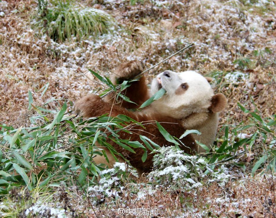 秦岭大熊猫野化培训佛坪基地,7岁的棕色大熊猫七仔是目前全世界唯一能看到的棕色大熊猫活体。今年是它在基地过的第二个冬天,每逢下雪,七仔就兴奋地满园子跑,变身“雪花熊”。央视记者李志 王志杰 图片来源:央视新闻官方微博