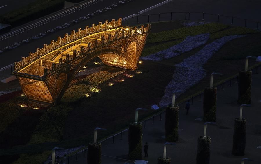 北京国家会议中心前的“丝路金桥”景观作品夜景(5月14日摄)。