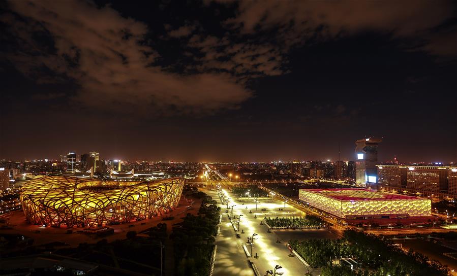 5月14日在玲珑塔上拍摄的鸟巢和水立方夜景。