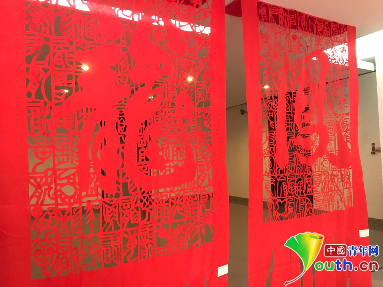 当天,中国青年网记者还走访了同城的中南民族大学。在中南民族大学的展览厅内,一场以剪纸和漆器为主题的展览正在进行。进入展厅,两幅巨大的剪纸作品自上而下垂落于展馆内。这两幅作品分别以百龙、百凤为主题,创新性的融入非物质文化遗产女书元素。他们的作者是中南民族大学文学与新闻传播学院教授何红一。