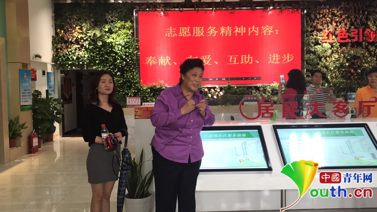 江欣苑社区党委书记胡明荣正在向来访记者介绍江欣苑在保护、传承“非遗”上的具体做法。中国青年网见习记者张潼 摄