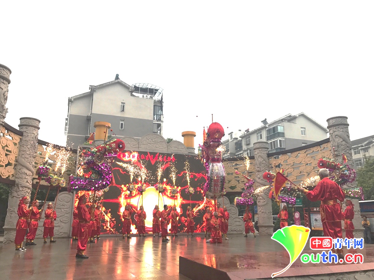 江欣苑社区居民正在表演高龙,高龙龙头重达48公斤。中国青年网 见习记者张潼 摄