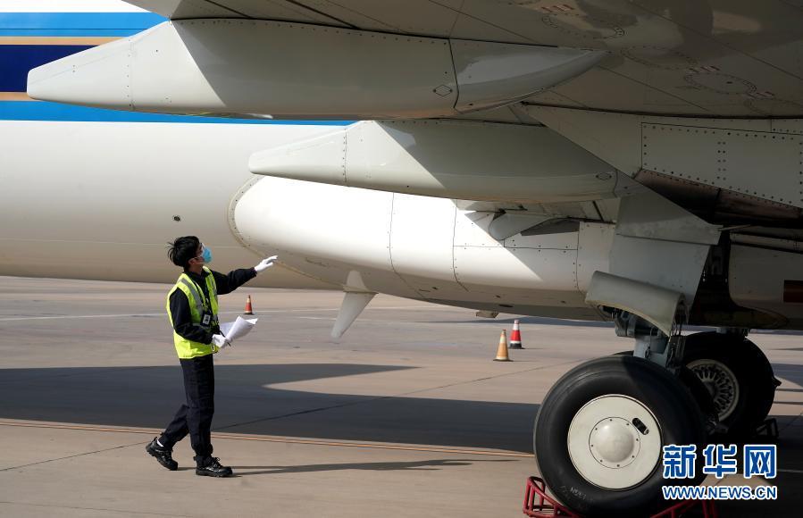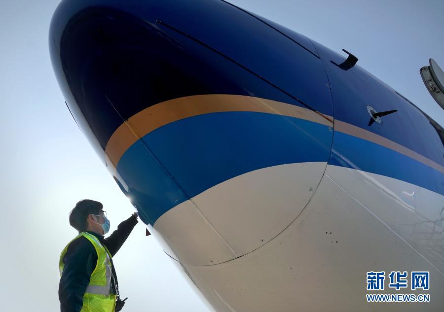 2月3日,南航河南公司机务工程师魏文楷在停机坪接完飞机后,用耳机与机组交流,确认飞机飞行状况。新华社记者 李安 摄