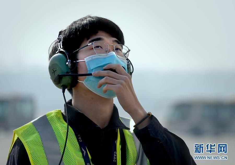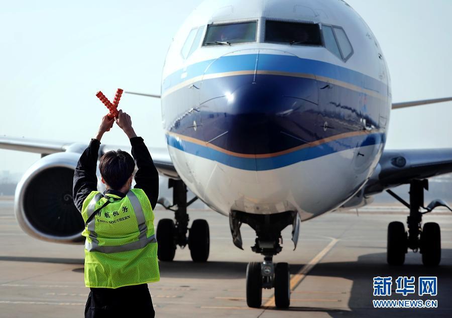 2月3日,南航河南公司机务工程师魏文楷在停机坪上指挥飞机准确泊位。新华社记者 李安 摄