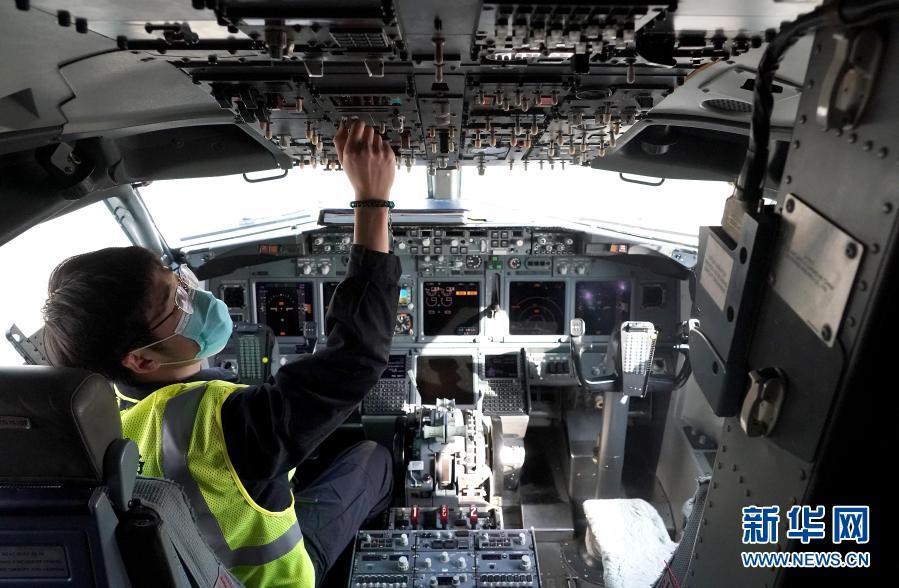 2月3日,南航河南公司机务工程师魏文楷在驾驶舱检查飞机电源系统状况。新华社记者 李安 摄