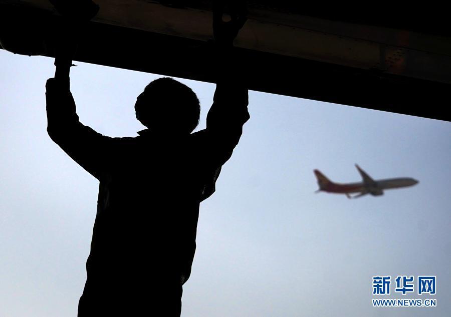 2月3日,南航河南公司机务工程师魏文楷用毛巾擦拭机翼下方油液。新华社记者 李安 摄