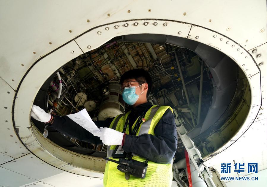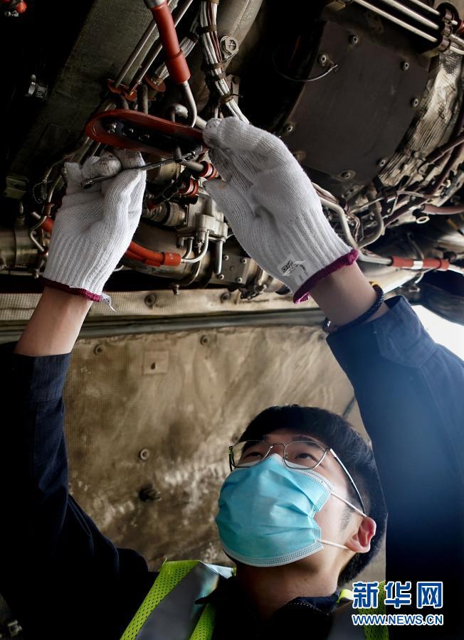 2月3日,南航河南公司机务工程师魏文楷按照维护工卡检查飞机轮舱部件。新华社记者 李安 摄