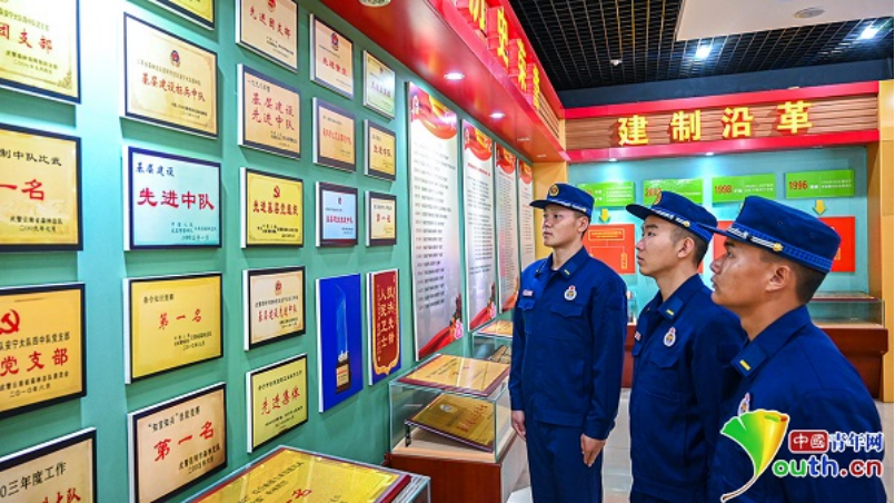 “能够加入这支光荣的队伍,我觉得十分荣幸和自豪,我要做好这支队伍的传人,接过先辈们的接力棒,走好属于自己的特勤路。”新消防员余潮磊在参观大队荣誉室时说。