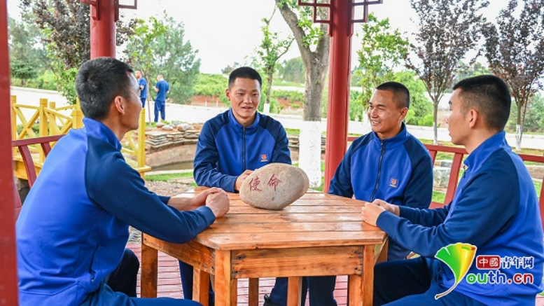 大队干部与新消防员在“谈心亭”进行座谈,介绍队伍情况,勉励新消防员保持良好的心态。