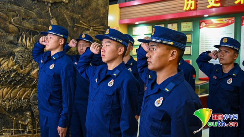 特勤大队组织新老消防员一起开展重温入队誓词活动。