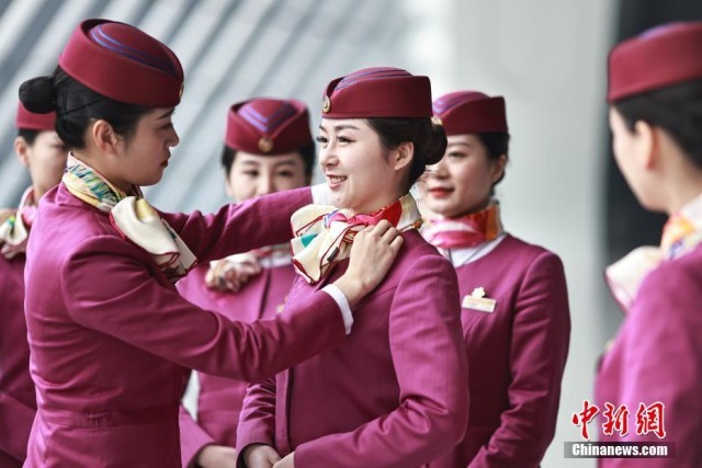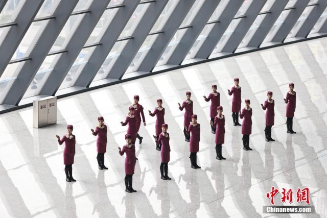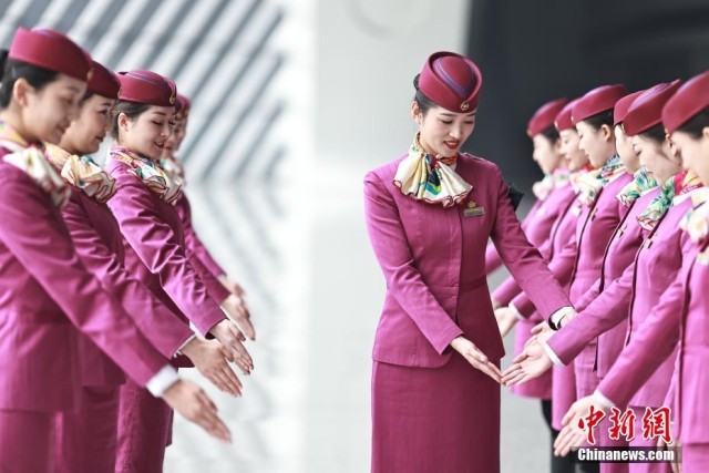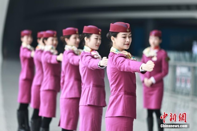 1月5日,2023年春运临近,中国铁路成都局集团有限公司重庆客运段动车五队组织乘务人员,在重庆西站进行基础业务、妆容礼仪等方面的集中培训,提升服务水平。图为乘务人员进行礼仪培训。 苏志刚 摄