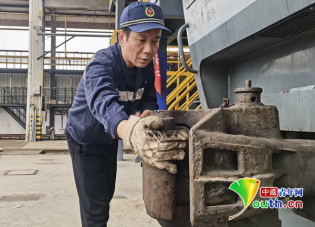 来到机车前端,将车钩穿销从涂满润滑油的销锁孔洞中取出,使销锁处于解锁状态,然后李铁树手握钩提拉杆使劲向上一抬,车钩完全打开,一系列动作如行云流水,干净利落。接着他用特制手电照亮钩体内壁、钩舌和钩体底部等暗处,便于检查车钩内部情况。车钩是火车头连接车辆的装置,一旦出现锁闭不紧或断裂,就会导致列车车体分离,失去控制,是检查的重点。确认风管、车钩等关键部位正常后,李铁树继续检查右侧走行部,此时已过去40秒。