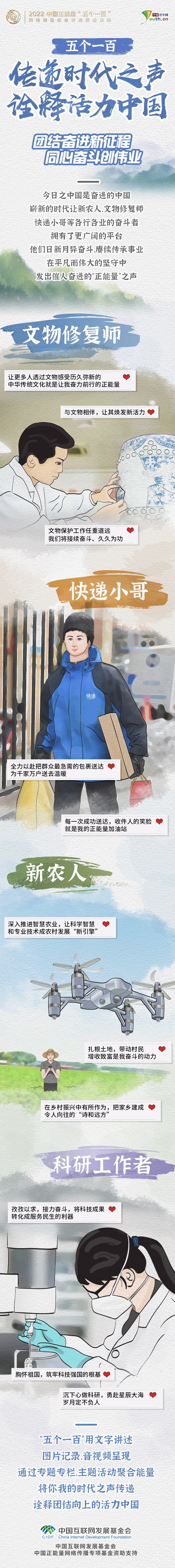 今日之中国是奋进的中国,崭新的时代让新农人、文物修复师、快递小哥等各行各业的奋斗者拥有了更广阔的平台,他们日新月异奋斗、赓续传承事业,在平凡而伟大的坚守中发出催人奋进的“正能量”之声。“五个一百”用文字讲述、图片记录、音视频呈现,通过专题专栏、主题活动聚合能量,将你我的时代之声传递,诠释团结向上的活力中国。(记者 刘尚君 潘晓文 朱钧有)