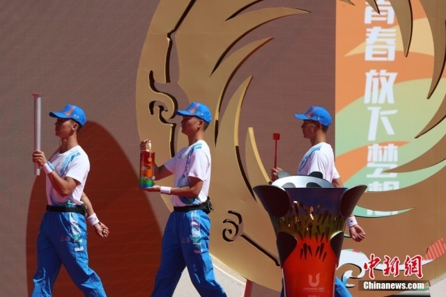 6月10日,成都第31届世界大学生夏季运动会火炬传递启动仪式在北京举行。31名火炬手在北京大学校园内进行火炬传递。图为火种盆被点燃。
