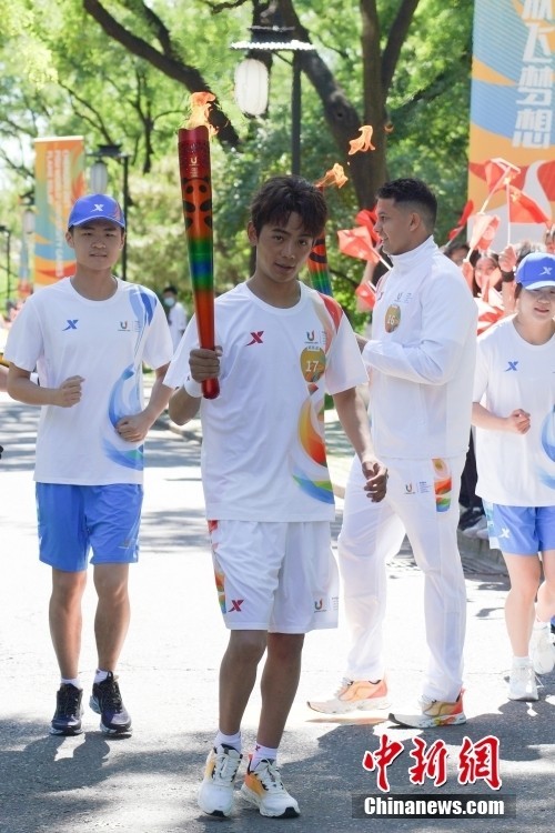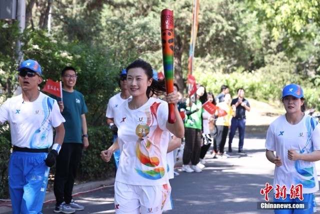6月10日,成都第31届世界大学生夏季运动会火炬传递启动仪式在北京举行。31名火炬手在北京大学校园内进行火炬传递。图为火炬手丁真珍珠。