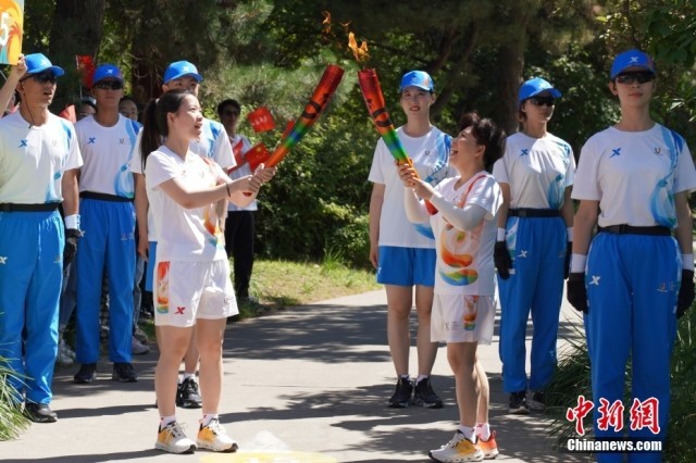 6月10日,成都第31届世界大学生夏季运动会火炬传递启动仪式在北京举行。31名火炬手在北京大学校园内进行火炬传递。图为火炬手邓亚萍和杨倩在交接火炬。