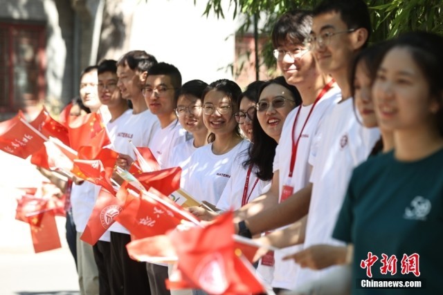 6月10日,成都第31届世界大学生夏季运动会火炬传递启动仪式在北京举行。31名火炬手在北京大学校园内进行火炬传递。图为北京大学学子迎接火炬。