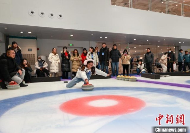 12月14日,民众在北京国家游泳中心体验冰壶运动魅力。中新社记者 贾天勇 摄