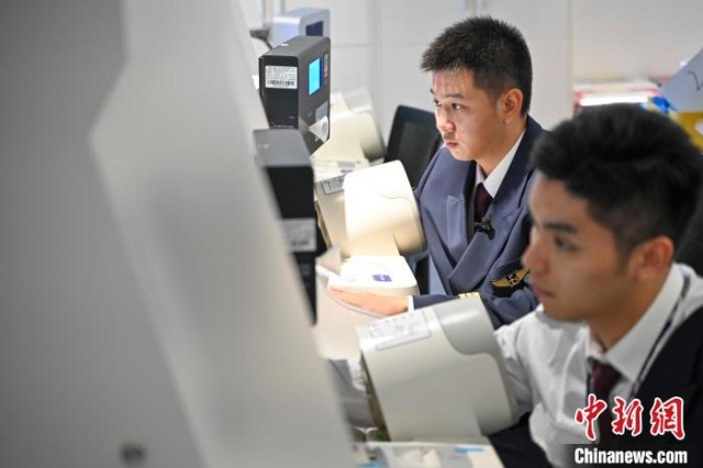 王伟进行飞行前的体检签到。记者 陈骥旻 摄