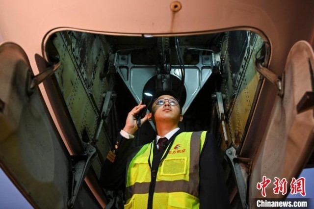 王伟为MU6751次航班的飞行做准备。记者 陈骥旻 摄