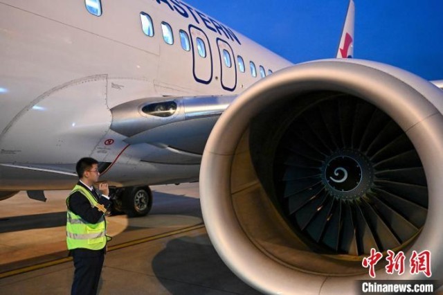 王伟检查MU6751次航班的引擎。记者 陈骥旻 摄