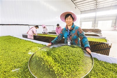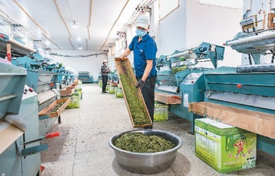 贵州省安顺市西秀区双堡镇银山茶场的茶农在制作茶叶。