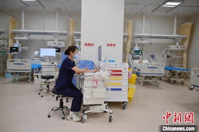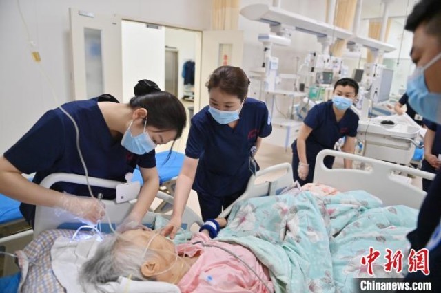 张力(左)对急诊监护区每位患者的情况都烂熟于心。护士们与患者朝夕相处,细心照护,关系已经超出了普通的医患关系。张力说:“他们的亲属不能在身边陪伴,但是我们每天可以和他们在一起,我们和这些患者的关系像亲人一样。” 张瑶 摄