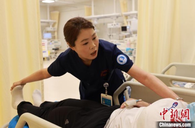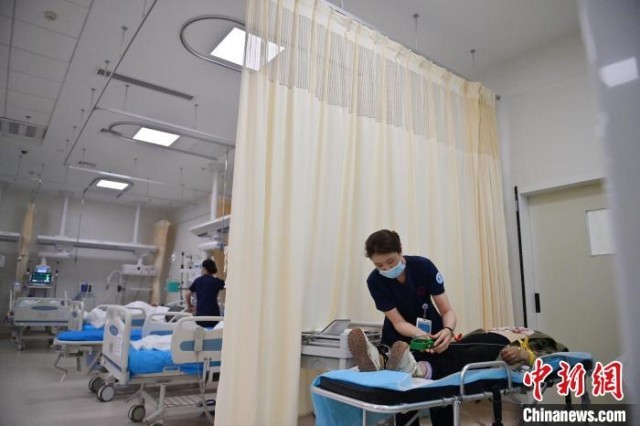 张力(中)在护理病人。急诊科的工作环境突发情况多、体力消耗大,所以对急诊护士的抗压能力和应变能力要求也更高。 张瑶 摄