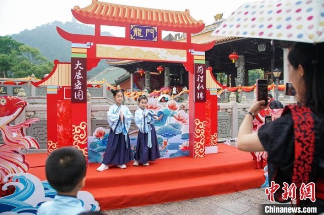 5月18日,在广西南宁孔庙博物馆,身着汉服的小学生在拍照。 陈冠言 摄
