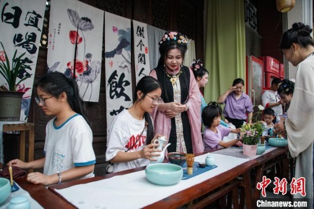 5月18日,在广西南宁孔庙博物馆,几名学生在体验点茶。 陈冠言 摄