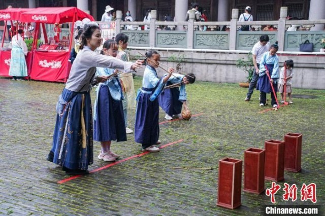 5月18日,在广西南宁孔庙博物馆,民众在体验投壶、捶丸等国风游艺项目。 陈冠言 摄