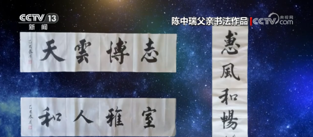 陈中瑞说他带了一些家人和朋友的照片,还带了几张父亲写的字。记者问他原因,陈中瑞称:“我父亲写的字挺好看,我也受他的影响,作为中国人来讲,汉字写得好了,其实也是从字能看到人。上去之前,我也没告诉我父亲干什么用的,就说你帮我写几幅字吧。”