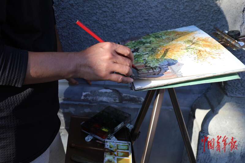 10月20日,北京五四大街,一名男子正在街边,用手中的画笔描绘五四大街的美丽秋景。中青报·中青网记者 陈剑/摄