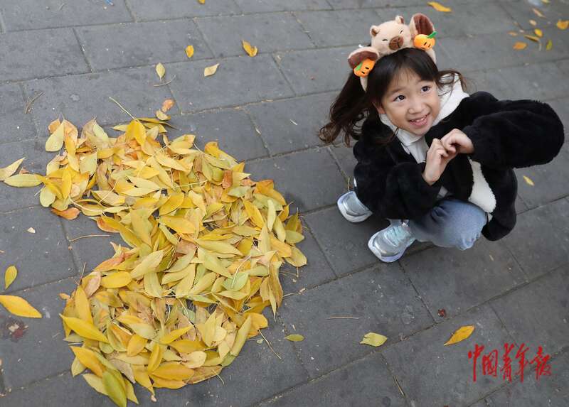 10月20日,北京五四大街,一名小朋友蹲在落叶堆成的爱心图案旁比“心”拍照。中青报·中青网记者 陈剑/摄