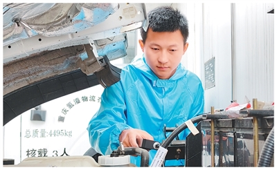 蔡开南检查氢能源汽车氢气管道密封情况。