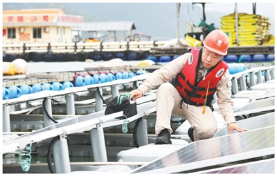 陈思伟在福建宁德市三都澳海域检查海上光伏设施。