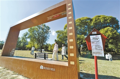 在朝阳公园万人广场,一个棕色的电影相框静静地立在“网红树”前的大草坪上。相框中间有一把椅子,一旁还摆着红色的邮筒。身穿白色婚纱的姑娘轻轻整理着裙摆,一旁西装笔挺的男孩扶着她的腰,随着对面摄影师的相机“喀嚓”响起,两人的幸福模样被定格在了秋日的暖阳里。“在朝阳公园拍婚纱外景是我们早就计划好的,没想到多了这样的相框,还挺出片的!”身着婚纱的姑娘说。