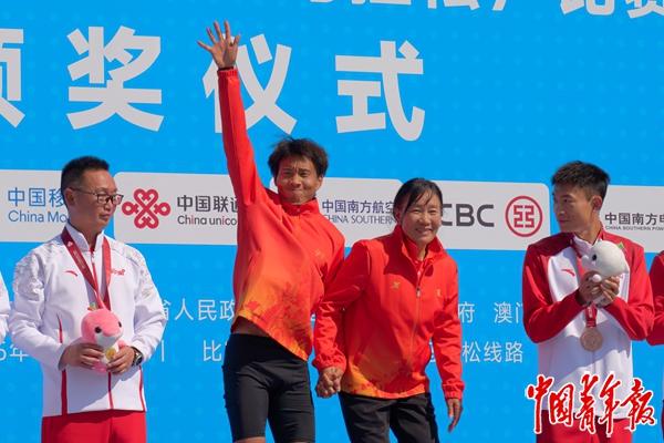 11月15日,广东深圳,十五运会田径(马拉松)比赛颁奖仪式,男子冠军何杰(左二)携手教练一起登上领奖台。中青报·中青网记者 田嘉硕/摄