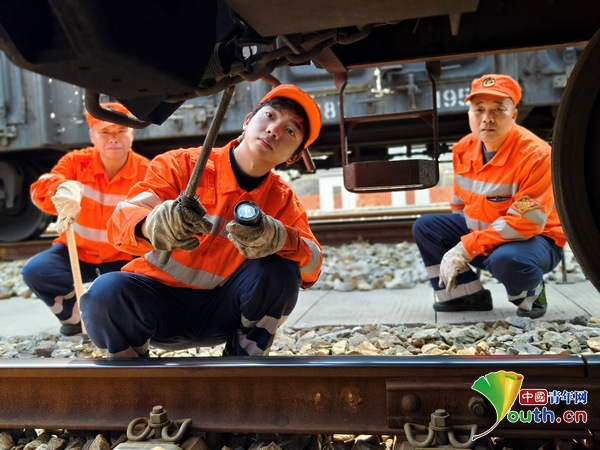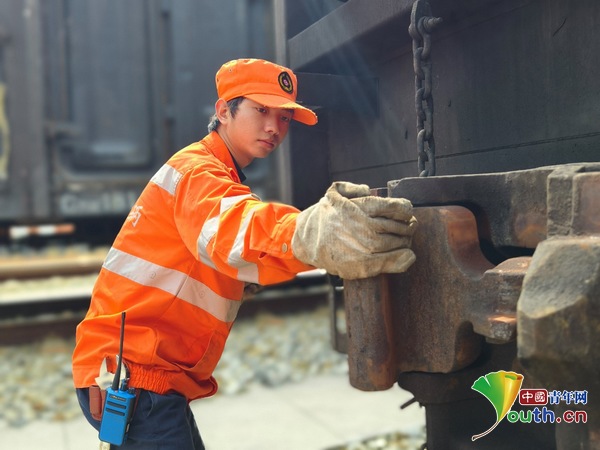 今年22岁的周弦参加工作的时间不长,却以超越年龄的沉稳和专注迅速成长为班组里的得力干将。检车工作不仅是体力活,更是精细的技术活。一个班次下来,他和同事需要检查数百辆货车,在车底、车侧反复弯腰、探身、敲击上千次,每一次敲击、每一处确认,都直接关系到列车运行的安全。