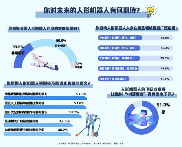 推动技术突破、完善产业链发展、带动青年在新技术领域就业创业……人形机器人的迅速发展为未来生活带来更多可能。近日,中国青年报社社会调查中心联合问卷网(wenjuan.com)发布的一项有1502名受访者参与的调查显示,92.6%的受访者看好我国人形机器人产业的发展前景,91.0%的受访者表示人形机器人的飞跃式发展让自己对“中国智造”更有信心。
