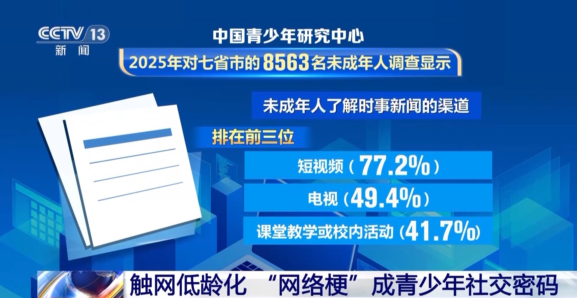 中国青少年研究中心2025年对七省市的8563名未成年人调查显示,未成年人了解时事新闻的渠道排在前三位的分别是短视频(77.2%)、电视(49.4%)、课堂教学或校内活动(41.7%)。