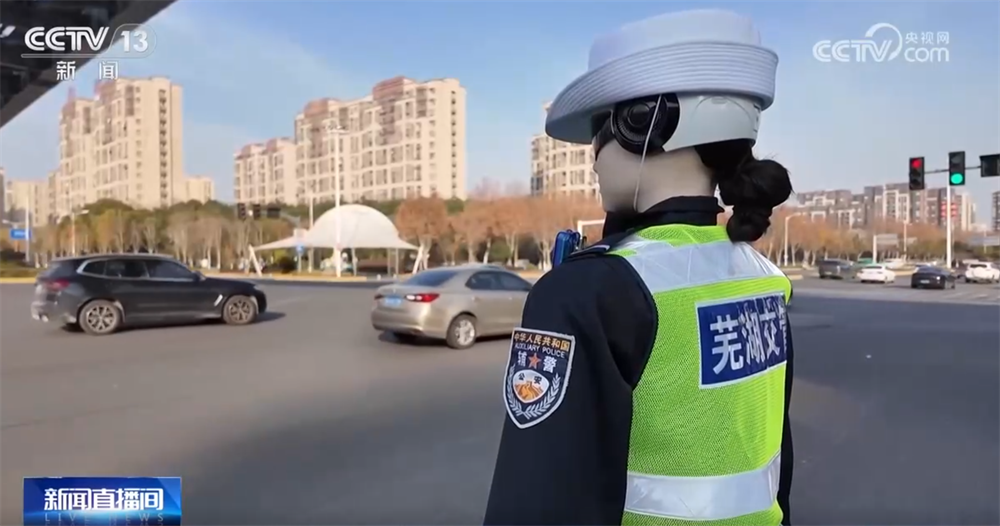 在安徽芜湖市城东新区的一处核心路口,机器人身着警服,胸前佩戴“芜湖交警”标识与“智警R001”编号,与现场交警协同配合,参与交通指挥与文明出行劝导。