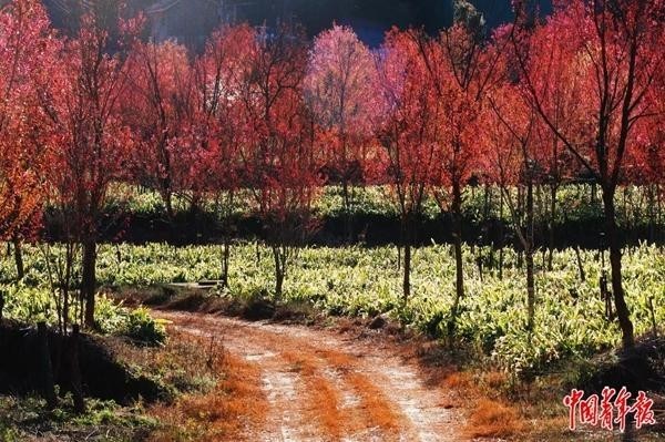冬季,昆明安宁市甸中村的樱花将村庄染红,宛如一场樱花盛宴。中青报·中青网记者 张文凌/摄