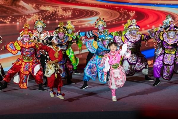 7岁的“英歌小女孩”庄恩琪(右)与8岁的“萌蛇小将”陈楷铭(左)联袂演绎英歌舞。主办方供图