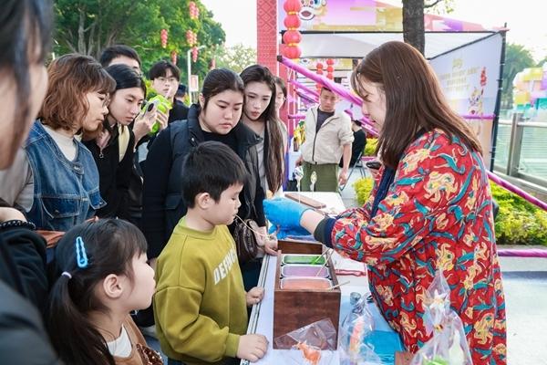 在“非遗赶潮集”的集市上,三大展区各有特色,其中,“寻味中国年”展区最是热闹。各地非遗美食与广东本土年俗小吃在此汇聚,卤香、酥香、甜香交织在一起,“舌尖上的中国年味”在此起彼伏的吆喝声里具象化。