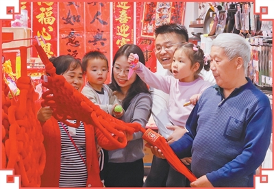 龙旺(右三)一家采购装饰品、春联。