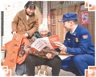 河南开封市杞县消防救援大队消防员向村民宣传春节防火知识。