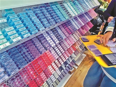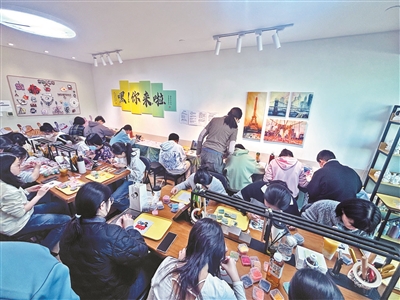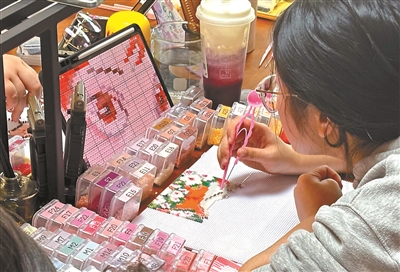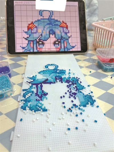 一个工作日的下午,北京一家位于西直门附近写字楼内的“不一样·银饰·DIY拼豆店”里,氛围安静,却几乎座无虚席。二十多名顾客各自操作拼豆板,桌边摆放着饮料或外卖,停留时间普遍较长。