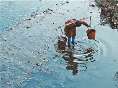 阿硅在县城漫步时遇到河边有居民在挑水
