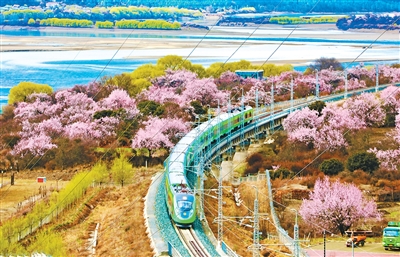 雅鲁藏布江河谷内,桃花盛放,绿色的高原复兴号穿梭其间,满载旅人抵达西藏林芝赏花观景。